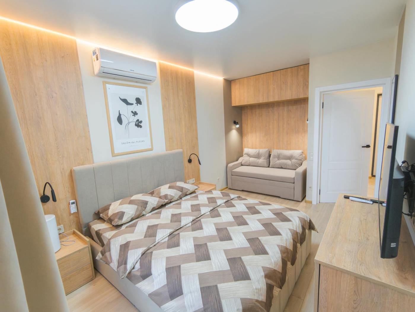 One-Bedroom Apartment. The air-conditioned apartment features 1 bedroom and 1 bathroom with a shower and a hairdryer. The fully equipped kitchen has a stovetop, a dishwasher, kitchenware and an oven. The apartment provides a washing machine, soundproof walls, a tea and coffee maker, a flat-screen TV with cable channels, as well as city views. The unit offers 2 beds.